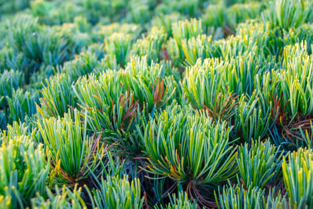 葉が1ヶ所に5枚生えることから、ゴヨウマツという名称がついています(アカマツやクロマツの葉は2枚です)。日本の各地で見られる日本原産の品種です。葉が小さめで密集してつくこと、樹齢が長いものが多いことなどから、盆栽としても庭木としても広く楽しまれています。