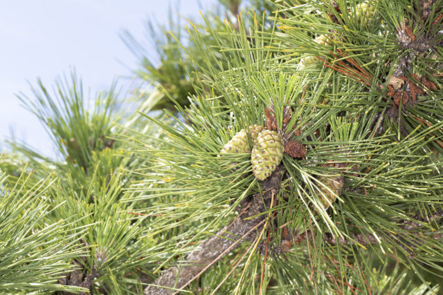 樹皮が黒いことが特徴で、本州から九州に多く見られますが、北海道でも生息しています。葉が比較的硬い特徴から雄松とも呼ばれます。塩害に強い特徴があるので、海岸付近に防砂林として植えられている松の多くはクロマツです。マツノザイセンチュウという害虫が繁殖すると枯れてしまうので、防砂林では定期的な殺虫作業が行われます。また、常緑樹であることから長寿の象徴とされた歴史があり、お祝い事などでも飾られます。